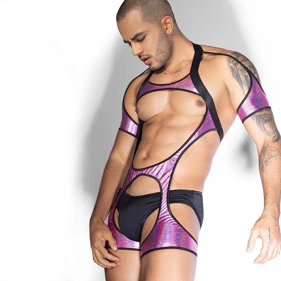 Men 2-Piece Red Leather Bodysuit Alluring Hollow Out Teddy