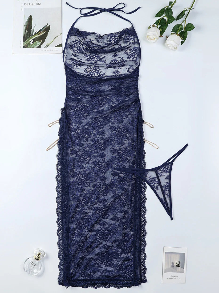 Transparent Lace Babydoll Nightgown Alluring Lingerie For Women Chain Bondage Sleepwear